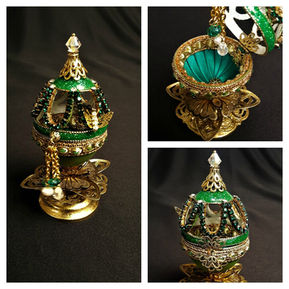 Esta hermosa técnica inspirada en los huevos Fabergé, se realiza haciendo diversos diseños de calados a alta velocidad y los convierto en hermosos estuches con bisagra, forrados y decorados con distintos ornamentos metálicos que los convierten en una verdadera joya y en un diseño único.